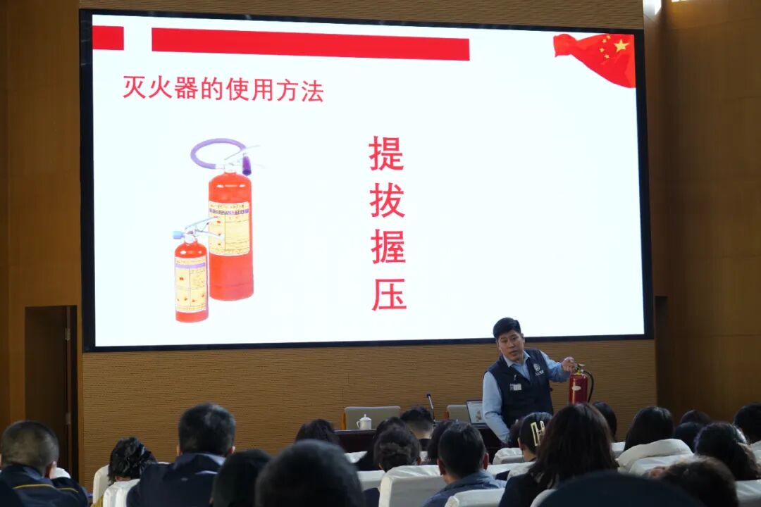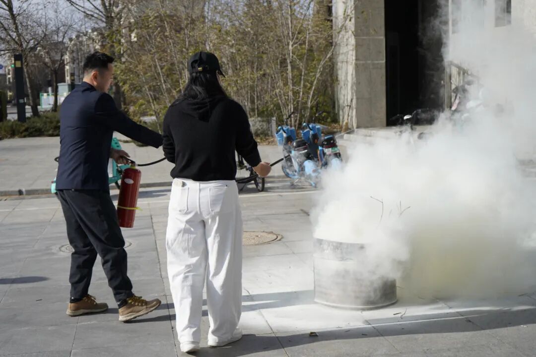 在灭火实操环节,消防专家现场演示了干粉灭火器“提、拔、握、压”四步操作要领,强调了灭火时需保持的安全距离和站立姿势,提醒大家使用前需检查灭火器表盘压力是否正常。参与人员分组上前实操,在专家的手把手指导下,亲手扑灭模拟火源,切实掌握了初期火灾扑救的实战技能。