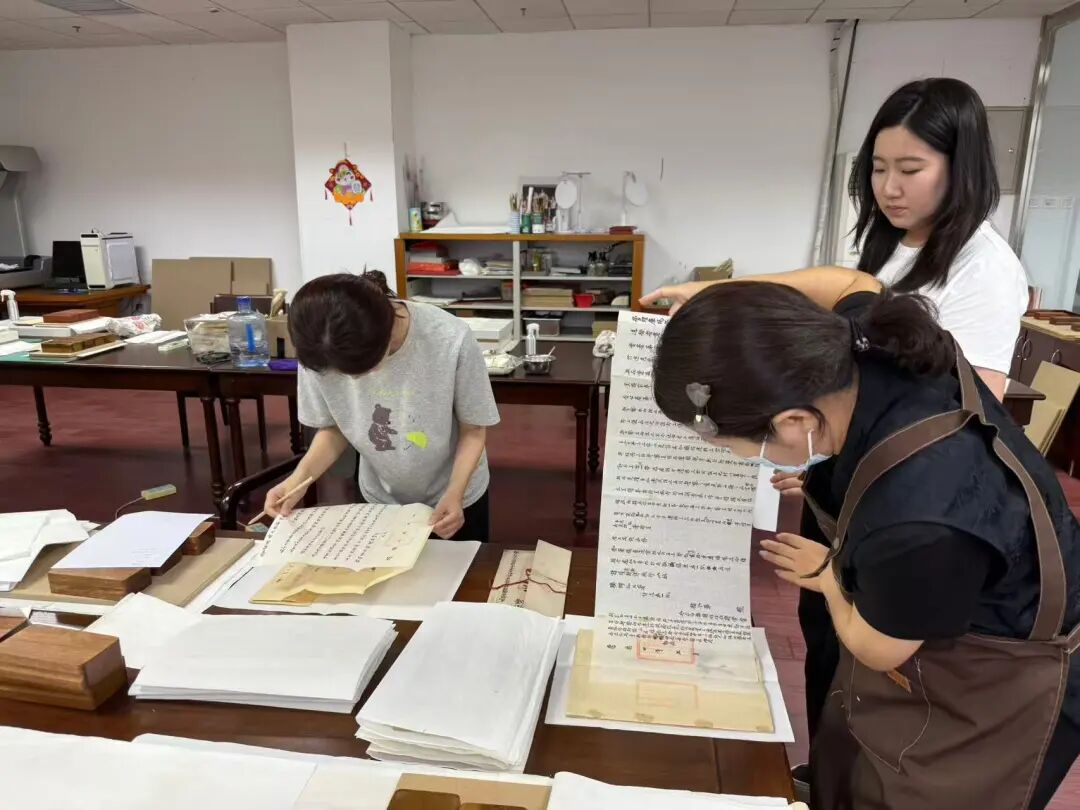 此次修复的古籍是《库玛尔路政府公文》。内容包括库玛尔路各级政权机构的设置沿革、人员任免、各项规章制度、行政区划演变、军队、宪兵队侦查和镇压抗日义勇军和各人民团体反满抗日活动、各宪兵队工作报告、各国驻伪满领事馆的活动、设医院、经营铁路、航运、办厂矿、移民开拓等政治、经济、军事和文化等各方面的材料。这类记录了清末至建国初期历史的档案,存在书叶磨损、脆化、重铸、鼠啮、污渍、破损等情况。我们遵循 “整旧如旧”“最少干预”的原则,进行修复。修补书叶时,坚持“先补中心,后补边”“先补大,后补小”的原则,用镊子细细梳理补纸搭口处的纤维,让修复痕迹尽可能隐蔽。这一关键工序里,我们学到了不少实用技艺。一开始,梳理纤维时会出现用力不当,导致补纸纤维断裂,要么让搭口处不够平整等情况。修复师们看到后,握着我们的手示范镊子的力度和角度,耐心讲解如何通过控制手腕力度,让镊子轻柔地梳理纤维,确保补纸与原书叶完美贴合。而最后进行的压平工序同样充满学问,修好的书叶上下垫上撤潮纸,压上木板和重物,期间还要根据情况更换纸张,确保古籍平整。修复师会根据古籍纸张的湿度、厚度,指导调整重物的重量和撤潮纸的更换频率,这些从实践中总结的经验,让我们少走了很多弯路。
