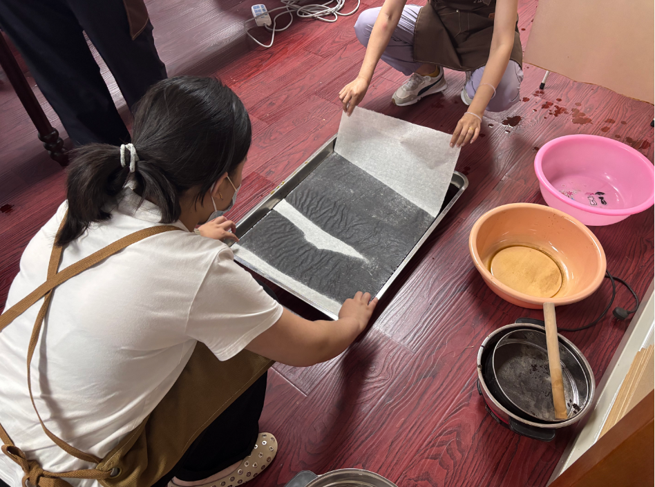 古籍修复的工作充满挑战,面对虫蛀、脆化的古籍,需要兼具科学家的严谨和艺术家的审美。光是制作修复用的浆糊,就需要掌握小麦淀粉和水的精准配比,还需要根据古籍的情况进行严格配纸。而遇到纸张颜色不匹配时,还要用橡碗子、红茶等材料为修复纸染色,确保与原书协调统一。有一次,为了匹配《库玛尔路政府公文》中一张泛黄程度特殊的纸张,我们在修复师的建议下,尝试染纸。她们带着我们认识橡碗子、红茶等天然染材的特性,讲解不同染材的浸泡时间、温度对染色效果的影响。按照修复师给出的配方尝试染纸,将橡碗子煮出的染液与少量红茶水混合,经过多次调试,终于染出了与原纸颜色几乎一致的修复纸,那一刻的成就感,让我们更加坚定了从事古籍修复工作的决心。